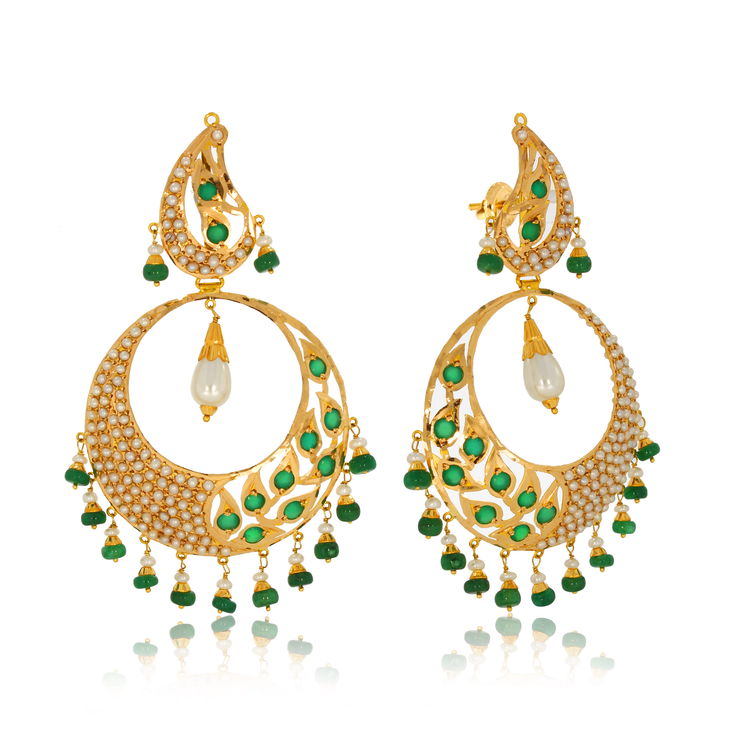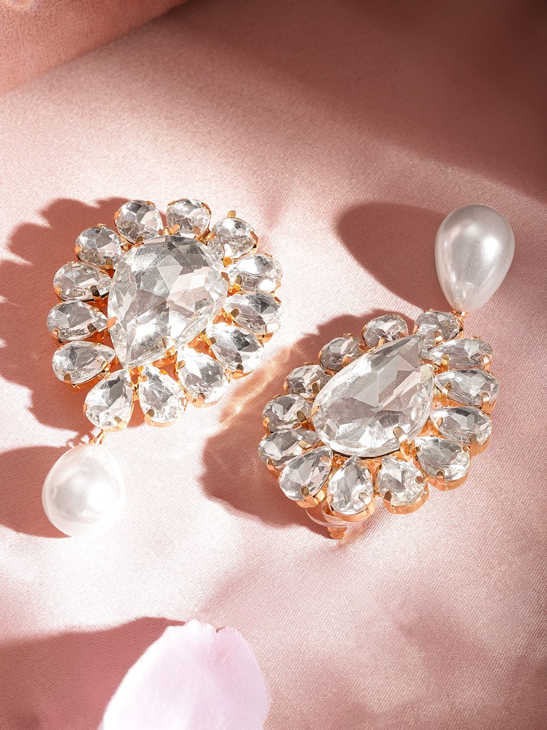 Gold- and white-toned alloy dangle earrings with pearl accents—glamorous and suitable for any occasion.