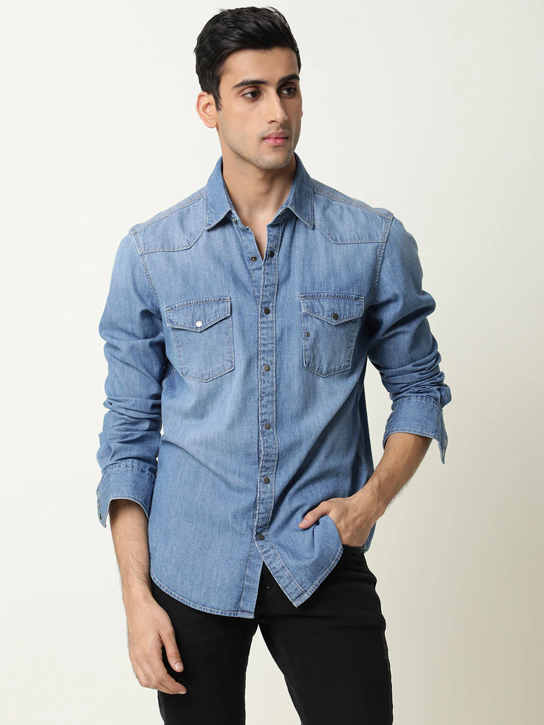 Add a rugged edge to your wardrobe with our Classic Denim Shirt in Light Blue Wash. Designed for versatility, it can be worn as a shirt or layered like a lightweight jacket. Crafted from durable denim cotton, it features front pockets, metal buttons, and a slightly faded wash for that vintage look. Team it with jeans, joggers, or cargo pants for a smart-casual vibe.