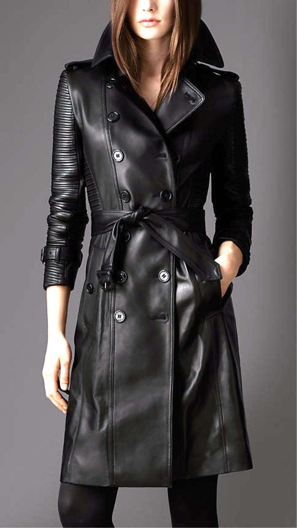 A leather trench coat adds drama and elegance to any wardrobe. Featuring a belted waist and buttoned front, this coat is ideal for fall and winter fashion. Wear it open for a flowing silhouette or cinch it for a sharp hourglass shape.